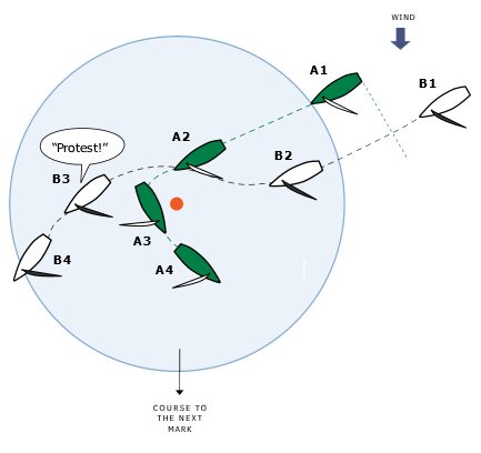 Boats A and B are approaching a mark to be left to port on starboard tack. The next leg is a downwind leg on which the boats will need to sail on both tacks to reach the next mark. A reaches the zone clear ahead of B, sails to the mark and gybes. After her gybe, B has to luff to avoid A and hails, “Protest!”