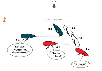 Boats A and B are reaching up the starting line on port tack with 30 seconds to go to the starting signal. There are no boats astern of B. As A approaches Boat S, on starboard tack, A hails, “Room to Tack!” B responds, “No way, you’re not close-hauled!” A bears away, sails astern of S and hails, “Protest!” B sails for two lengths and tacks to leeward of S.