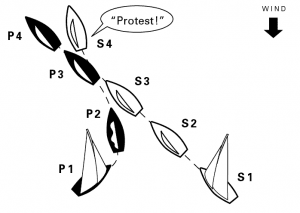 Boats P and S, two close-hauled boats on opposite tacks, are approaching a windward mark to be left to starboard. S hails, “Starboard!” P tacks to keep clear and protests S for not tacking and sailing her proper course to the mark.