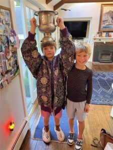 There are a number of awards; overall champion, the family award, and the “Stoke” award. Thomas and Finn won the Stoke award, which comes with a cup-like trophy, a sleazily purple jacket and some Mardi Gras beads. Finn accepted the award solo because Thomas was whisked off to a soccer game, but when they reunited back at the house, the picture was worth a thousand words…think they’ll want to go back next year?