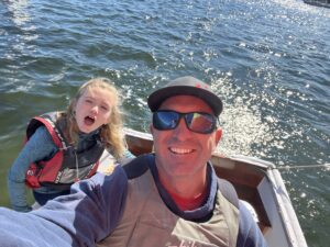 Oliver was supposed to sail with his 5-year-old daughter Nell, but she thought better of it, bequeathing her spot to two other kids who had just showed up to spectate. Again, how good? Getting two new sailors on the water, and to roll with a flexible plan. I was sailing with my daughter, Maggie, in the Dyer Dhow. I’ve done some pretty harrowing things on the water, but I’d never felt as exposed as I did when I was leaving the Wickford breakwater, with my daughter in the bow and virtually no freeboard. But, on we went towards the rockpile. The circumnavigation of the rockpile ensured that we were in fact Archipelago Rally compliant.