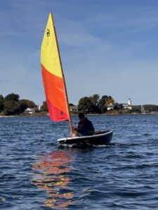 We temporarily snuck by Thomas and Finn, who started two minutes early, but no one cared, when the Kouton family distracted them with peanut butter filled pretzels. However, when their focus returned, they passed us again…as did most everyone else. I believe we were 31st and 32nd respectively, stuck together like glue, a race to the bottom, like only waring siblings know how to do. In the end, the Ross Weene led crew won, on a Thistle of all boats. The fleet totaled 40 ralliers, the biggest assembly to date. The weather was a contributing factor – 60 degrees, sunny skies, and a gentle breeze. But, I’m sure the 20th anniversary was part of it, too, as was the fact that they’d built something fun and enjoyable, that families can do on a nice fall day.