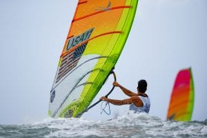 Cádiz, SPAIN (April 27, 2021) – Tokyo 2020 Representatives in the RS:X Windsurfing class Pedro Pascual and Farrah Hall took on Spain’s breeze and waves this week for the RS:X World Championship, joining fleets of 42 and 28, respectively. Day one brought gusts of 44+ knots that ultimately kept sailors and race committee shoreside for the day, but the rest of the event went on as planned with conditions that simulated what sailors expect to see this summer in Enoshima, Japan.