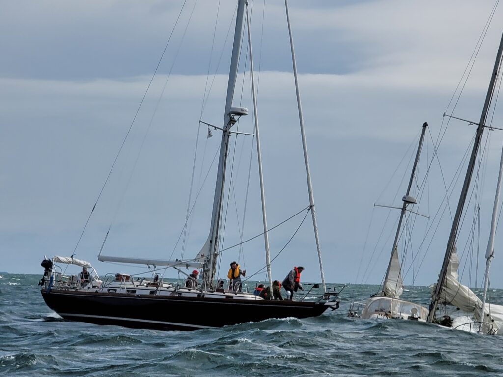 The incident happened on Saturday September 21st, 2024, during the annual Cross Sound Challenge. Chris Morano’s classic Pearson 39 Yawl Dorian began taking on water as they approached a mark of the racecourse. After a complete and thorough inspection, her crew could not locate the source of water intrusion, and considering the extreme rate of ingress, they immediately went into Mayday protocols and began preparing to abandon ship. While the Coast Guard was quick to respond, they were too far away, so the crew instead switched VHF frequencies to alert their nearby competitors.
