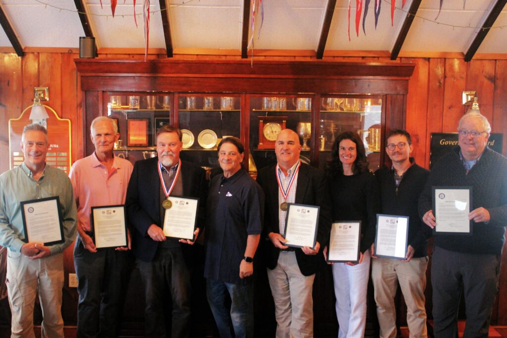 BRISTOL, RI (October 7, 2025) – The US Sailing Safety at Sea Committee awarded the Arthur B. Hanson Rescue Medal to the skippers and crew of two yacht racing sailboats for their rescue of the skipper and crew of a competitor’s sailboat which sank during a regatta on Long Island Sound.